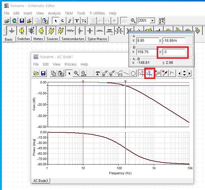 b그래프 모양의 아이콘을 클릭합니다. 그리고 Gain그래프에 마우스를 클릭합니다. 그림의 B의 y값에 -3을 입력합니다.
