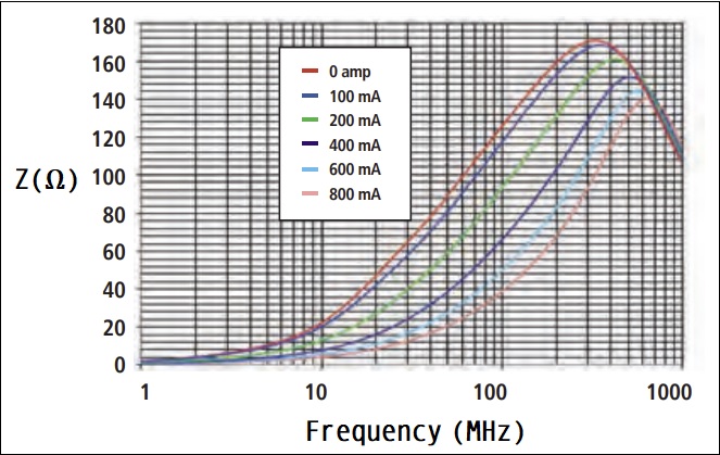 비드의 데이터 시트를 많이 보신 분들은 아시겠지만 제조사들은 데이터 시트에 100MHz의 임피던스를 주로 표기합니다. 그리고 주파수 응답 특성 그래프는 오직 Zero DC 바이어스 전류에서 측정한 결과만 보여줍니다. 물론, 제조사마다 다르지만 전류 변화에 따라 주파수 응답 특성 그래프를 모두 보여주는 데이터 시트도 있습니다. 그러나 대부분은 zero DC 바이어스 전류에서 측정한 그래프만 보여줍니다.