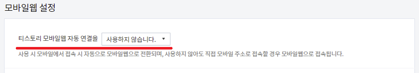 그리고 티스토리 모바일웹 자동 연결을 사용하지 않습니다. 설정으로 변경합니다.