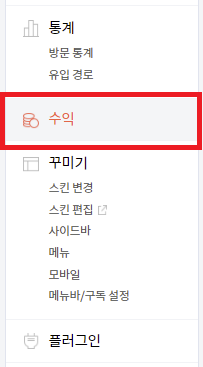 다시 관리자 모드에서 화면 왼쪽 아래에 보시면 수익 메뉴가 있습니다. 수익 메뉴를 클릭합니다.