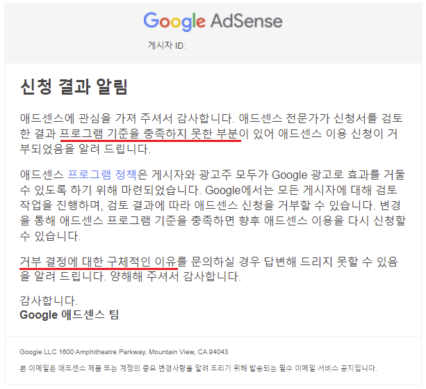 첫 번째 구글 애드센스 신청은 거부되었습니다.