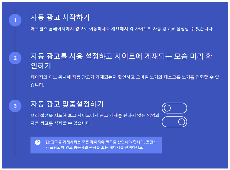 구글 애드센스 승인 메일을 받으시면 아래 사진처럼 자동 광고 시작하기 안내 설명이 있습니다.