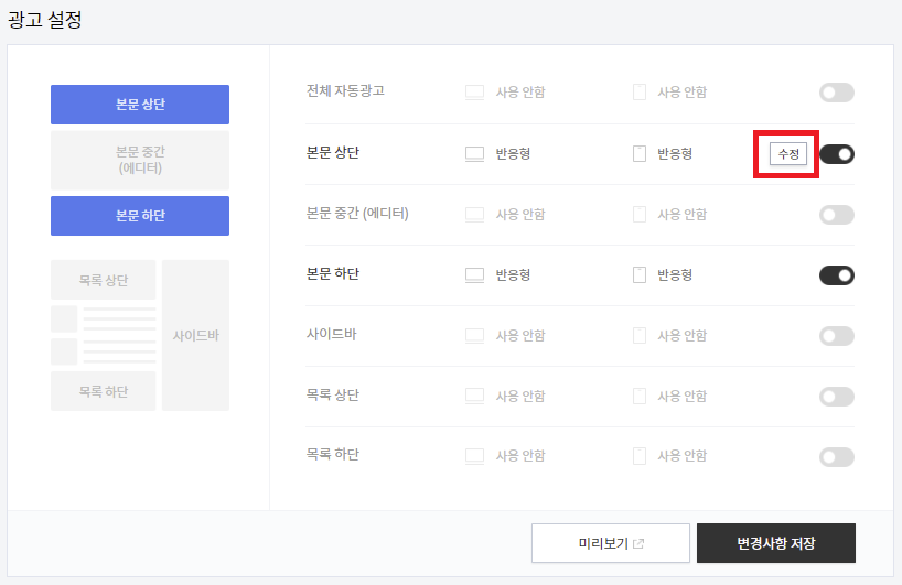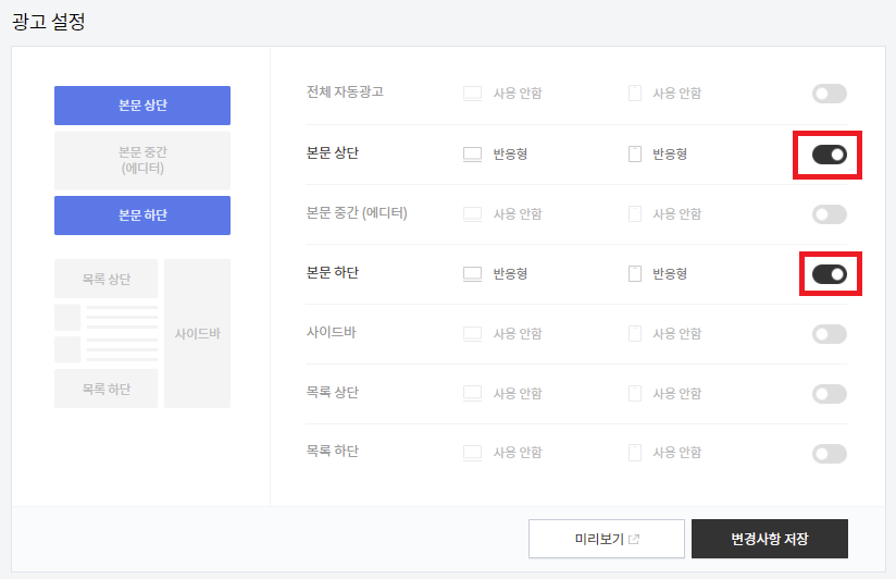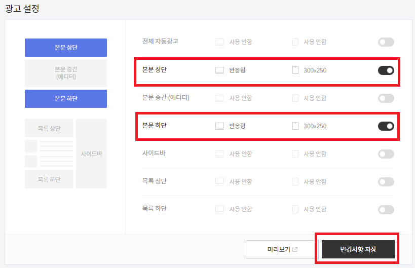 저는 본문 상단과 본문 하단에 광고를 게재하고 싶어 해당되는 메뉴를 클릭해서 활성화시켰습니다.