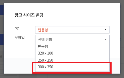 그러면 위 그림처럼 메뉴가 보입니다. 그리고 모바일을 클릭하시고 광고 사이즈를 300 x 250 고정으로 변경합니다. 본문 하단도 동일하게 변경합니다.