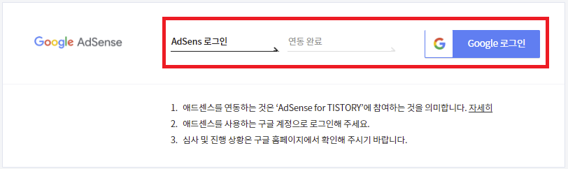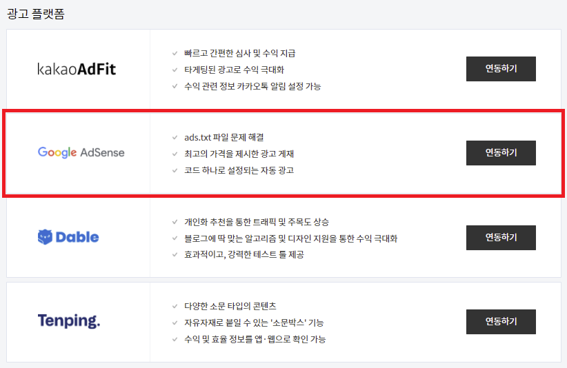 수익 메뉴에 들어가시면 위 그림처럼 광고 플랫폼 연동을 할 수 있습니다. 구글 애드센스 연동하기를 클릭합니다.