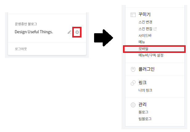 먼저 블로그 관리자 모드로 접속합니다. 그리고 화면 왼쪽 아래에 꾸미기 - 모바일 메뉴를 클릭합니다.