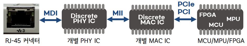 마지막 인터페이스 설계 방법은 개별 PHY IC, 개별 MAC IC를 사용한 방법입니다. 마지막 방법을 보시면 눈치채셨겠지만 첫 번째 인터페이스 설계 방법에서 IC에 통합되지 않고 계속 세부적으로 나누어지고 있습니다. 그러므로 앞서 말씀드린 내용처럼 각 IC들과 개별적인 인터페이스로 데이터를 주고받습니다. 개인적인 생각으로 이 방법은 하나의 IC안에 기능을 통합시키는 반도체 회로 설계 기술이 없을 시절에 많이 사용했을 거라고 생각합니다. 반도체 집적 회로 기술이 발전하면서 개별적인 기능을 하나의 IC에 통합하면서 첫 번째 인터페이스 설계 방법으로 발전했다고 생각해 볼 수 있습니다.
