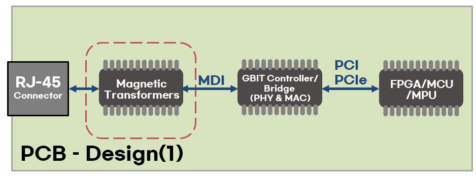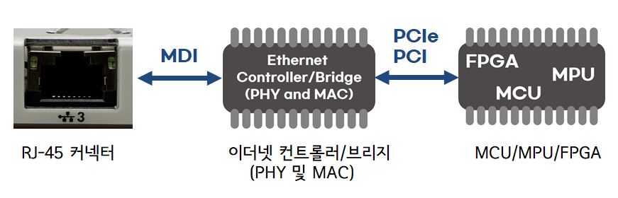 일반적으로 LAN 포트라고 알고 있는 RJ-45 커넥터와 이더넷 컨트롤러/브리지, FPGA/MCU/MPU 등을 이용하여 MDI와 PCI/PCIe 통신 연결로 인터페이스 설계를 할 수 있습니다. 참고로 MDI는 Medium-Dependent Interface입니다. 그리고 첫 번째 방법은 선호도가 높은 인터페이스 연결 방법은 아닙니다.