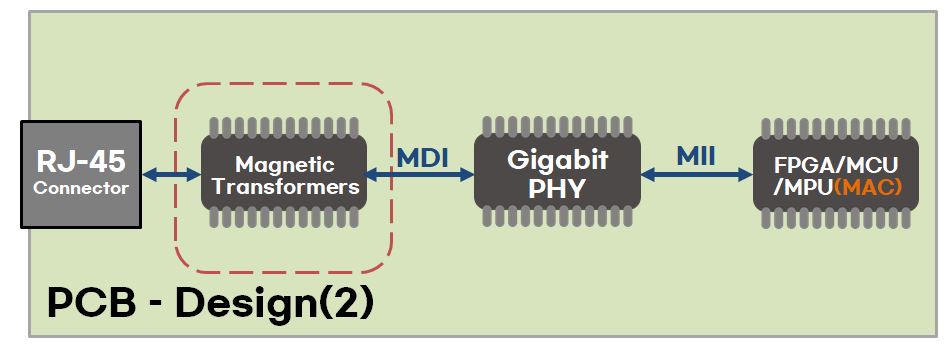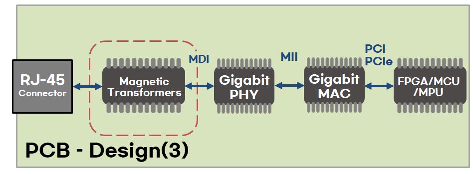 앞에서는 기가비트 이더넷 인터페이스 설계 방법을 알아보았습니다. 기가비트 이더넷 PCB 설계 방법은 크게 다르지 않습니다. 앞서 봤던 인터페이스 연결에서 RJ-45 커넥터와 PHY IC 사이에 변압기(Ethernet Magnetic Transformers)만 추가해주면 됩니다. 그 이유로는 IEEE 802.3 이더넷 표준(Ethernet standard)은 PHY가 전송 매체로부터 전기적으로 절연되어야 한다고 명시하고 있기 때문입니다. 그러므로 변압기(Ethernet Magnetic Transformers)를 추가하여 절연을 해야 합니다.