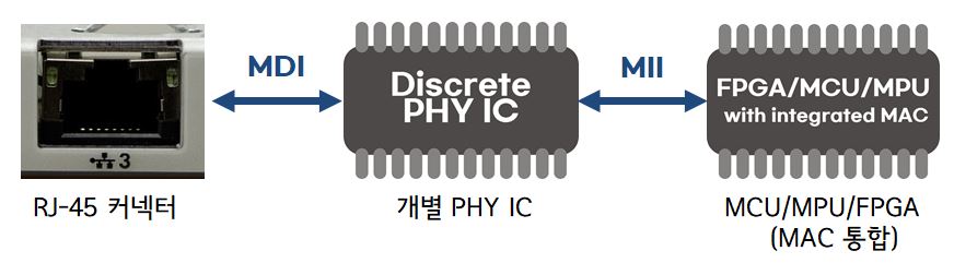 두 번째 방법으로는 개별 PHY IC를 사용하고 MAC은 FPGA, MCU, MPU에 통합한 인터페이스 연결 방법입니다. 가장 일반적으로 많이 사용하는 방법입니다. 케이블부터 PHY IC까지는 앞에서 보았던 물리적 계층(Physical Layer)입니다. PHY IC부터 마이크로프로세서, 마이크로컨트롤러까지는 데이터 링크 계층(Data link Layer)입니다. PHY가 작업을 완료 후에 MII(Medium-Independent Interface)를 통해 MAC 컨트롤러로 직접 전송합니다. 마지막으로 MAC 컨트롤러는 정의된 프로토콜에 따라 프레임 구조를 생성하고 검증합니다.