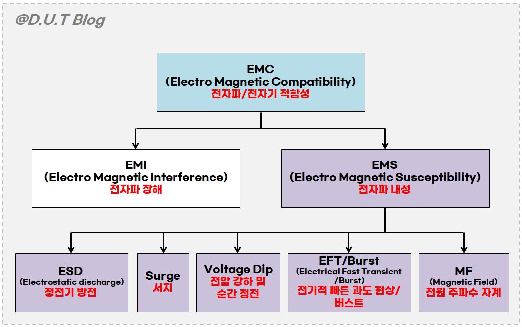 추가적으로 앞에 EMS(Electro Magnetic Susceptibility) 전자파 내성 시험에서 제외한 시험들도 그림에 포함시켜봤습니다 ESD 내성 시험, Burst 내성 시험, Surge 내성 시험, MF 내성 시험, Dip 내성 시험입니다.