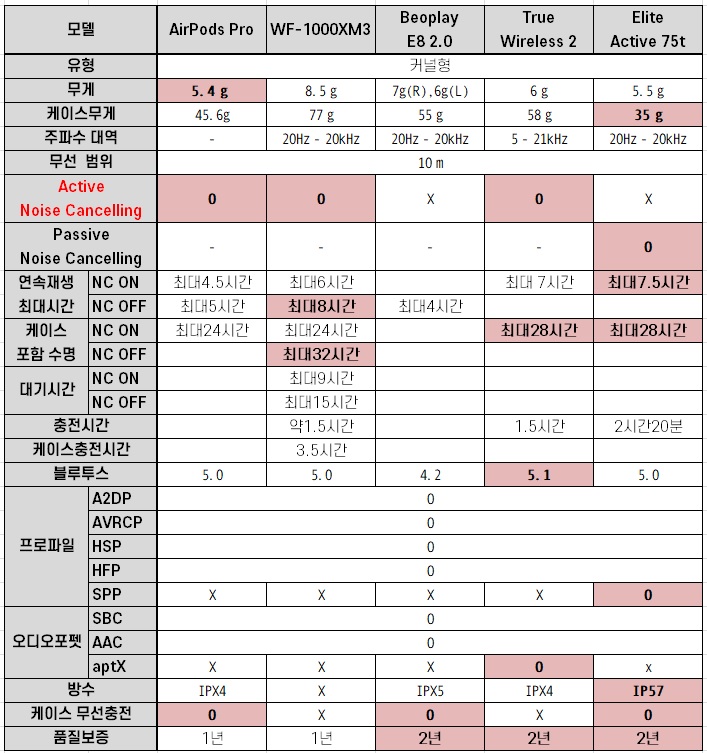 세부적인 스펙들을 살펴보면 공통적으로 겹치는 부분이 많습니다. 필요한 용도에 맞게 블루투스 이어폰을 꼼꼼히 비교하셔서 구매하시면 될 것 같습니다.