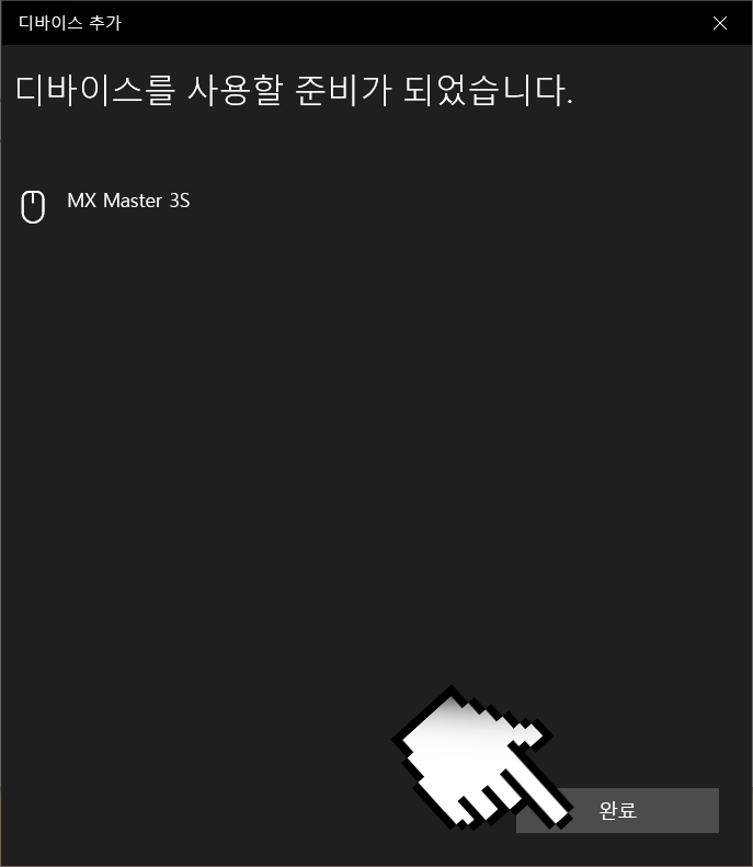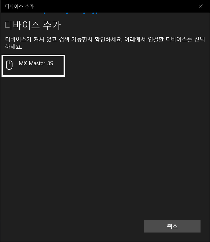 주변에 블루투스 장치 탐지가 완료되면 위 화면처럼 나타납니다. 저는 최근에 구매한 무선마우스 로지텍 MX Master 3S를 연결을 진행했으므로 화면에는 MX Master 3S가 확인됩니다.