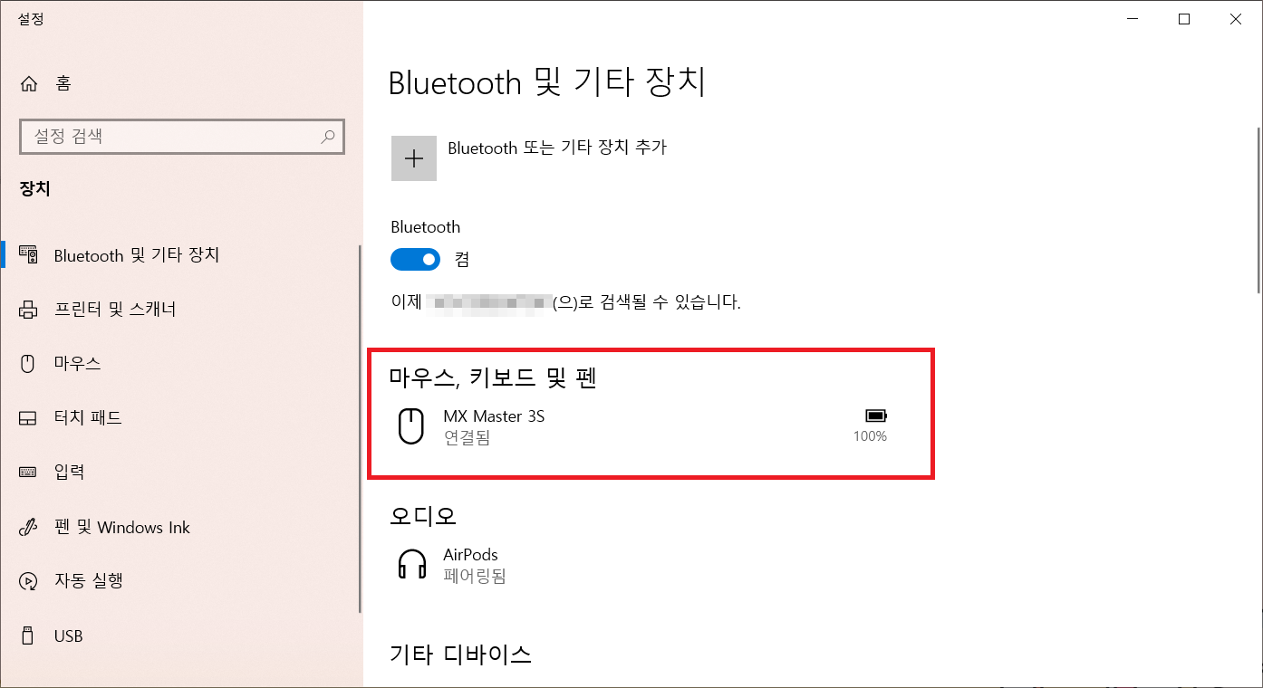 이제 무선 마우스를 블루투스 연결 방법으로 사용할 수 있습니다. 로지텍 MX Master 3S 마우스는 배터리 용량 표시도 지원을 해서 그런지 배터리 상태도 확인할 수 있습니다.
