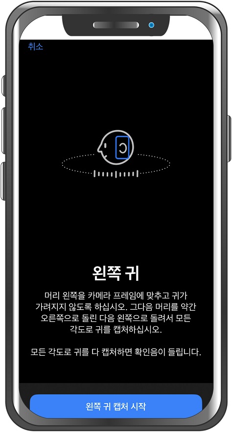 왼쪽 귀도 동일합니다. 왼쪽 귀 캡처 시작 메뉴를 터치하면 카메라로 왼쪽 귀를 스캔(?) 합니다!