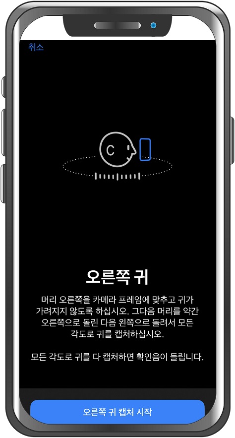오른쪽 귀 캡처 시작 메뉴를 터치하면 카메라로 오른쪽 귀를 스캔(?) 합니다!