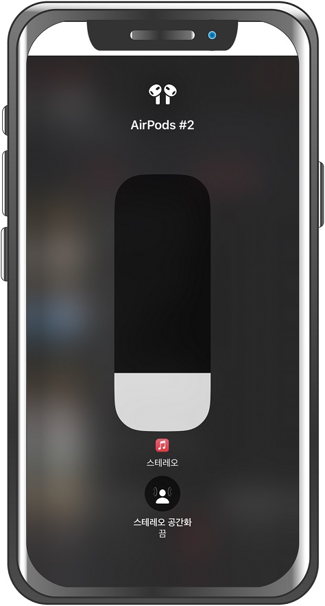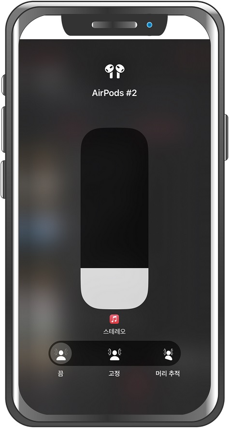 에어팟을 연결하고 소리 제어 볼륨 메뉴를 누르면 위와 같은 상태가 됩니다. 그리고 스테레오 공간화 끔 버튼을 터치합니다.