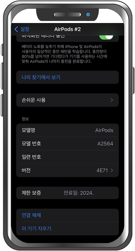 에어팟 1세대에서는 제한 보증 정보는 없었습니다. 에어팟 3세대는 제한 보증 날짜가 표시됩니다.