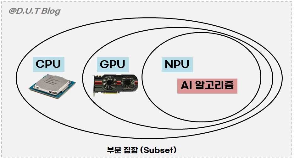 부분 집합 관계로 NPU에서 할 수 있는 인공지능 알고리즘 계산을 GPU에서도 가능하고 GPU에서 가능한 인공지능 알고리즘 계산을 CPU에서도 가능합니다.