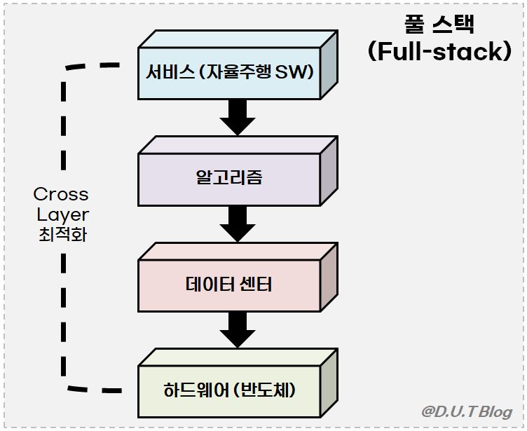 풀 스택(Full-stack) AI, 수직(Vertical) AI를 잘하려면 알고리즘과 서비스에 맞게 하드웨어와 인프라를 최적화해야 하므로 보다 유기적이고 통합된 시스템이 필요합니다. 테슬라는 서비스-인프라-하드웨어-소프트웨어를 모두 갖추고 있기 때문에 풀 스택 AI, 수직 AI를 가장 잘할 수밖에 없다고 합니다. 결론적으로 테슬라는 맞춤형 칩(FSD)과 Cross layer 최적화로 지원되는 자율주행 서비스를 현재 서비스하고 있기 때문에 가장 성공적으로 구현한 기업의 사례로 꼽히고 있습니다.