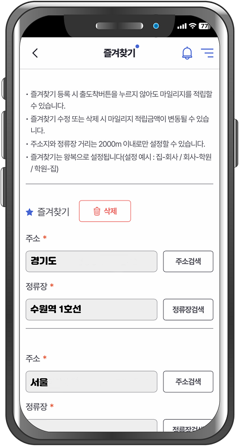 알뜰교통카드 앱에 즐겨찾기를 등록하면 출발하기, 도착하기 버튼을 누르지 않아도 마일리지가 적립됩니다!