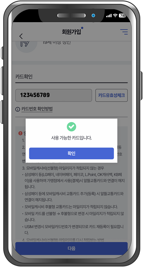카드확인 입력란에는 발급받으신 알뜰교통카드 카드 번호를 입력하면 됩니다.