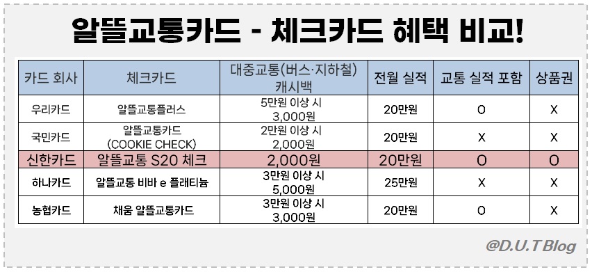 각 카드사에 상품설명서를 보고 알뜰교통카드 체크카드 혜택을 비교해 봤습니다.