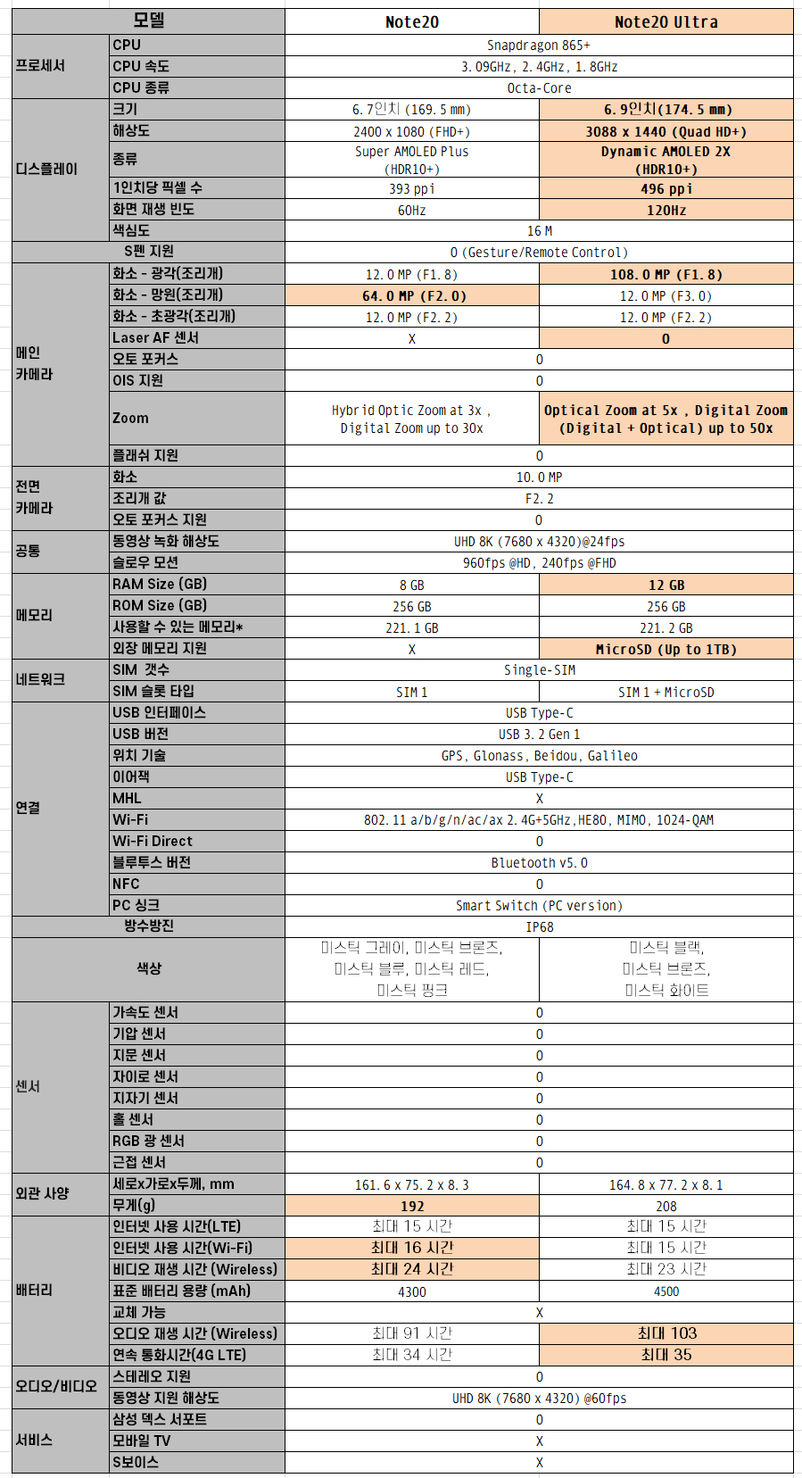 「 갤럭시노트 20 울트라 vs 20 스펙 비교 」