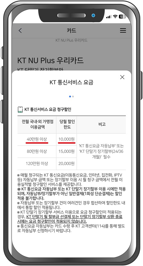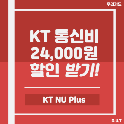 KT NU Plus 우리카드를 신청하시고 자동 납부를 하시면 저처럼 할인을 받을 수 있습니다.