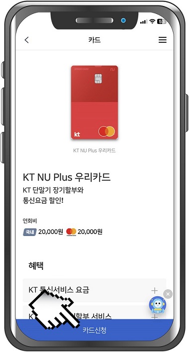 우리카드 앱에서 KT NU Plus 우리카드를 신청합니다.