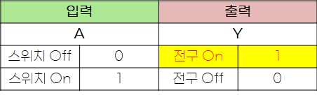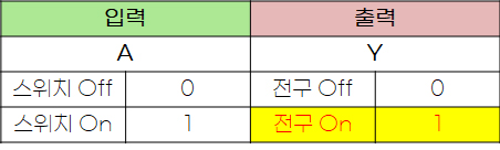 A 스위치 연결된 상태가 Off( A=0 ) 이면 전구와 배터리가 연결 안 된 개방회로 상태가 됩니다. ( Y=0 )