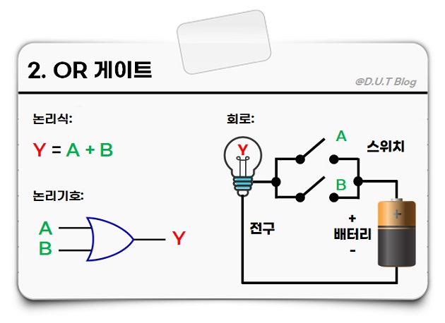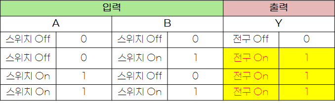 앞에서 살펴본 AND 게이트와 다르게 A 스위치 혹은 B 스위치 1개만 On이 되어도 전구가 배터리와 연결되어 전구에 불이 켜집니다. ( Y=1 )