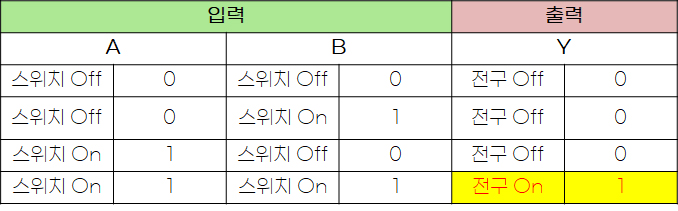 회로를 보시면 A, B 두 개의 스위치 모두가 Off( A=0, B=0 )가 되면 전구에 불이 꺼집니다. ( Y=0 )