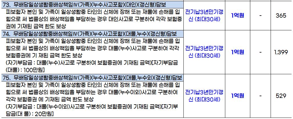 73. 무배당일상생활중배상책임Ⅳ(가족)(누수사고포함)(대물,누수외)(갱신형)담보