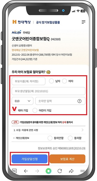 가입 상담 신청 방법은 현대해상 홈페이지에서 전화가입상품 메뉴, 굿앤굿어린이종합보험Q 페이지에서 이름, 성별, 부모생년월일, 전화번호를 입력하고 가입상담신청을 진행하면 됩니다.