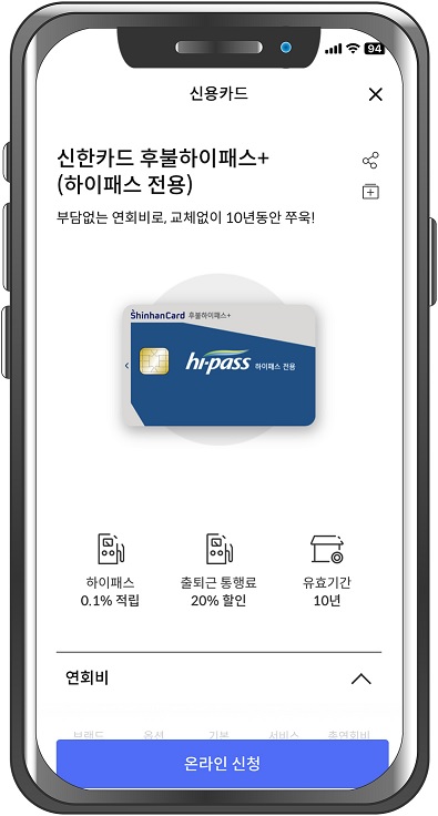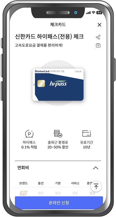 체크카드와 마찬가지로 신용카드도 기존 신한 개인 신용카드를 가지고 있어야만 추가 발급으로 하이패스 신용카드를 이용할 수 있습니다.