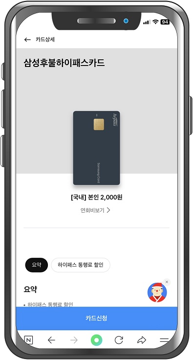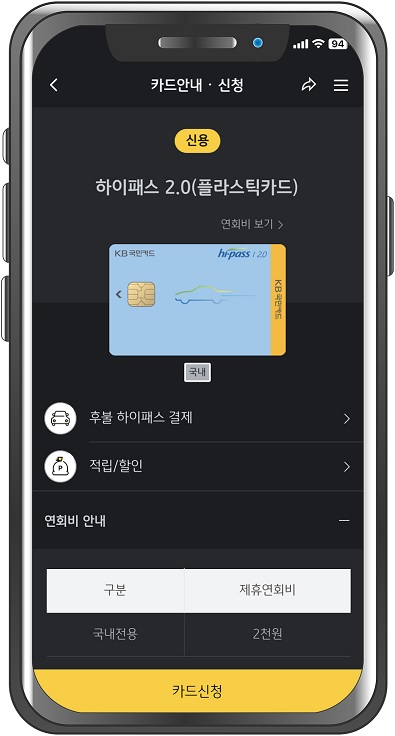 하이패스 체크카드입니다. 연회비는 없지만, 최초 발급수수료 5,000원이 있습니다.