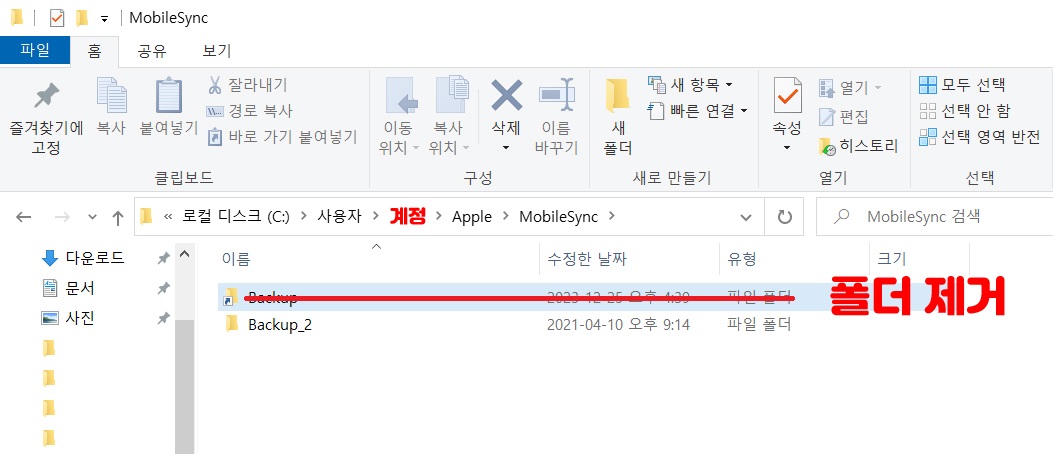 폴더 경로에 가셔서 아이폰 백업 폴더 경로를 변경한 폴더를 제거해 주시면 됩니다.