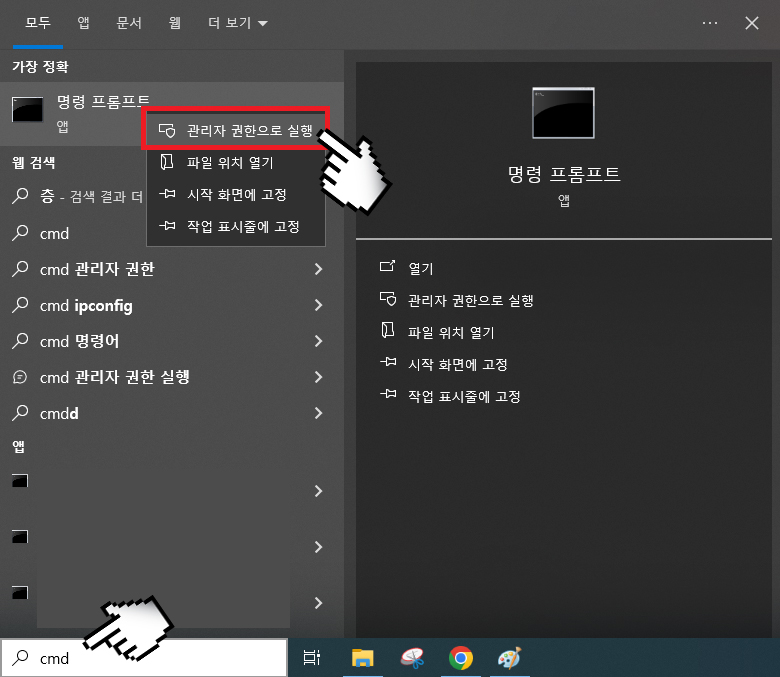 2. 명령 프롬프트에서 오른쪽 마우스를 클릭하여 관리자 권한으로 실행!