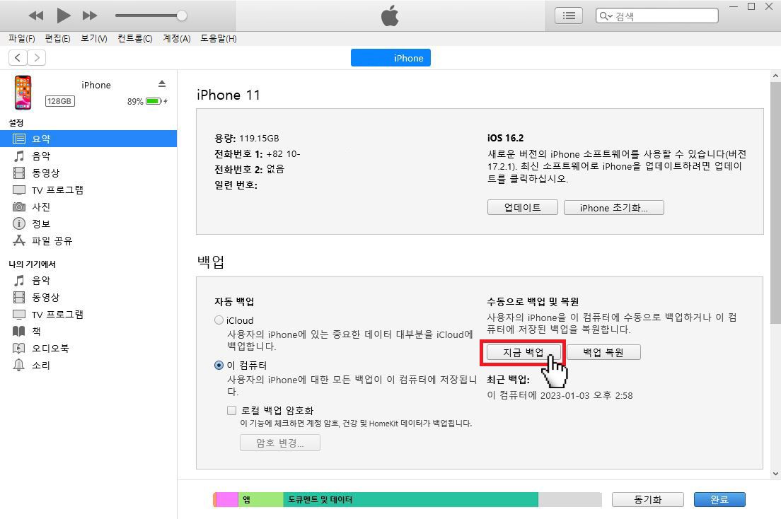 3. 아이폰 백업 폴더 경로를 변경한 폴더를 제거하면 정상적으로 아이폰 백업을 진행할 수 있습니다!