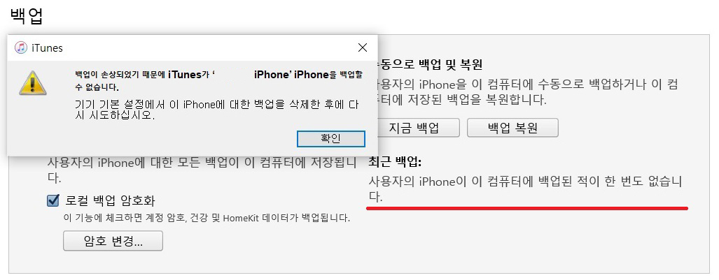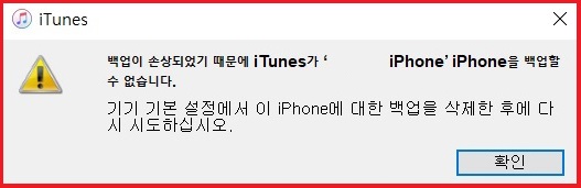 백업이 손상되었기 때문에 iTunes가 '사용자의 iPhone' iPhone을 백업할 수 없습니다.