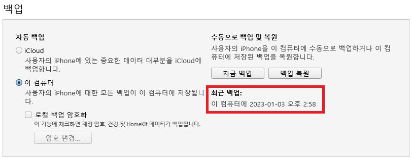 1. 위에 그림처럼 iTunes 최근 백업에 한 번이라도 아이폰 백업을 진행하셨으면 아이폰 백업 폴더 경로를 변경해서 백업을 진행하셔도 백업이 됩니다.
