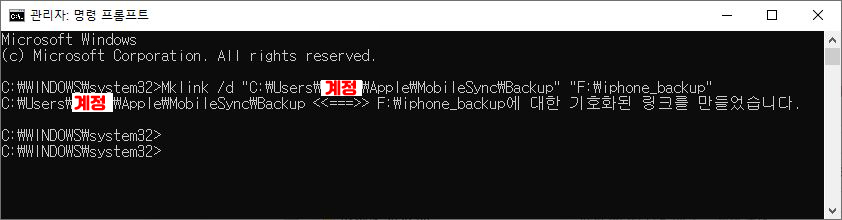 예) Mklink /d "C:\Users\윈도우 로그인 계정\Apple\MobileSync\Backup" "F:\iphone_backup"