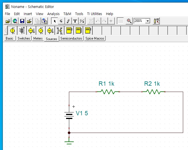 가장 간단한 회로이므로 직관적으로 전압이 2.5V로 나누어지는 것을 알 수 있지만, 시뮬레이션을 통해 확인해보겠습니다.