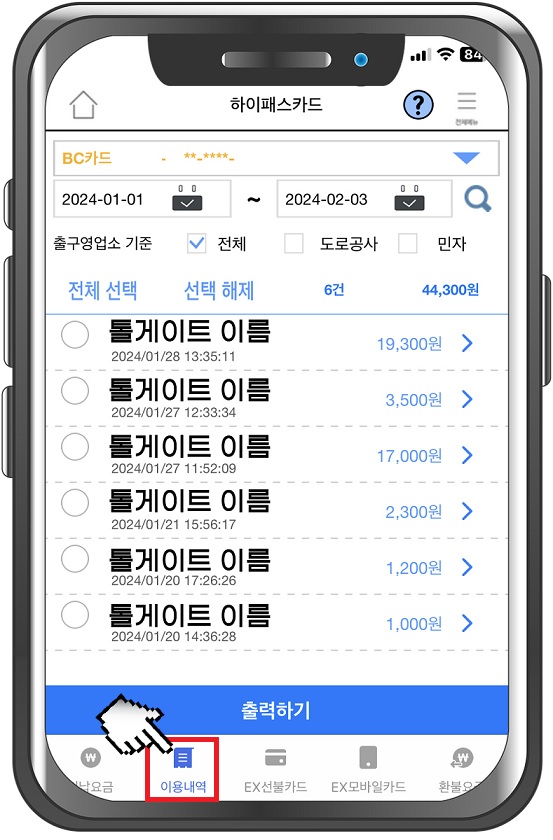 하이패스 이용내역에서 확인한 44,300원과 카드사 결제예상금액이 일치합니다.