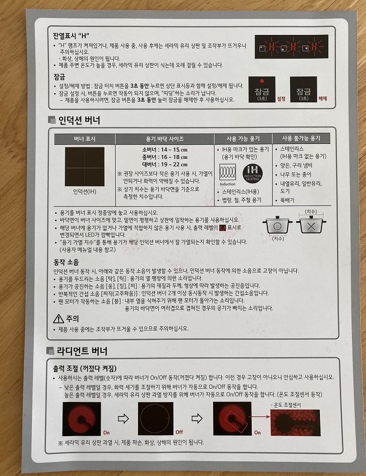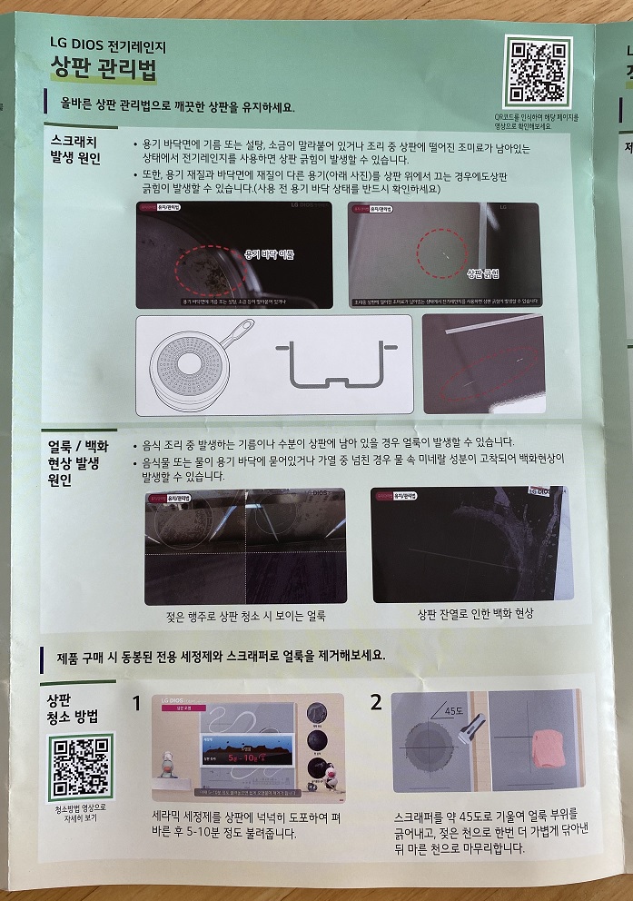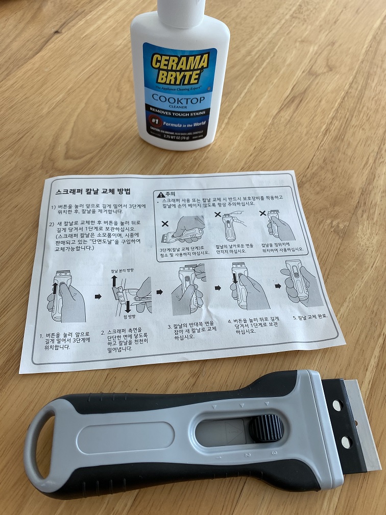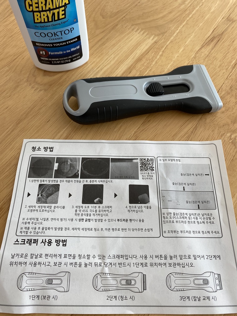 인덕션에 상판 관리가 엄청 중요한지, 스크래퍼가 제공되고 친절한 설명서까지 포함되어 있습니다.