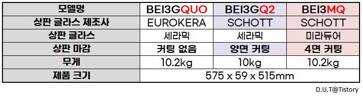 나머지 기능은 모두 동일하지만, 상판 제조사와 글라스, 마감 차이로 인해 가격 차이가 있다는 것을 알게됐습니다.