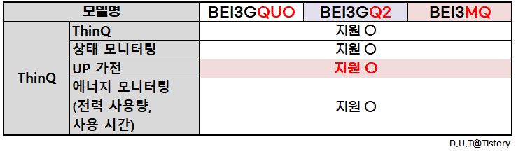 그러나, 제가 LG전자 공식 홈페이지에서 확인한 결과는 BEI3GQUO 모델은 UP가전을 지원한다고 표시되어 있습니다.
