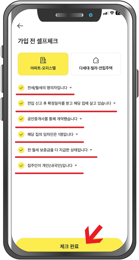각자 해당하는 주택 유형을 선택하고 각 항목을 터치합니다.