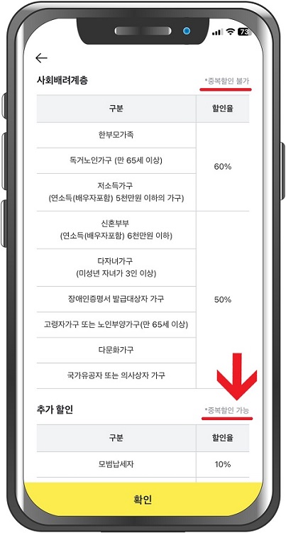 추가적으로 사회배려계층이면 큰 할인을 받을 수 있습니다.